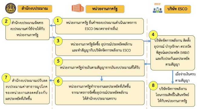 8) เมื่อหน่วยงานภาครัฐชำระเงินค่าอุปกรณ์ประหยัดพลังงานครบตามสัญญา บริษัทจัดการพลังงานโอนกรรมสิทธิ์ในสินทรัพย์ให้กับหน่วยงานภาครัฐเพื่อนำไปขึ้นบัญชีครุภัณฑ์และจัดทำงบประมาณในการบำรุงรักษาต่อไป