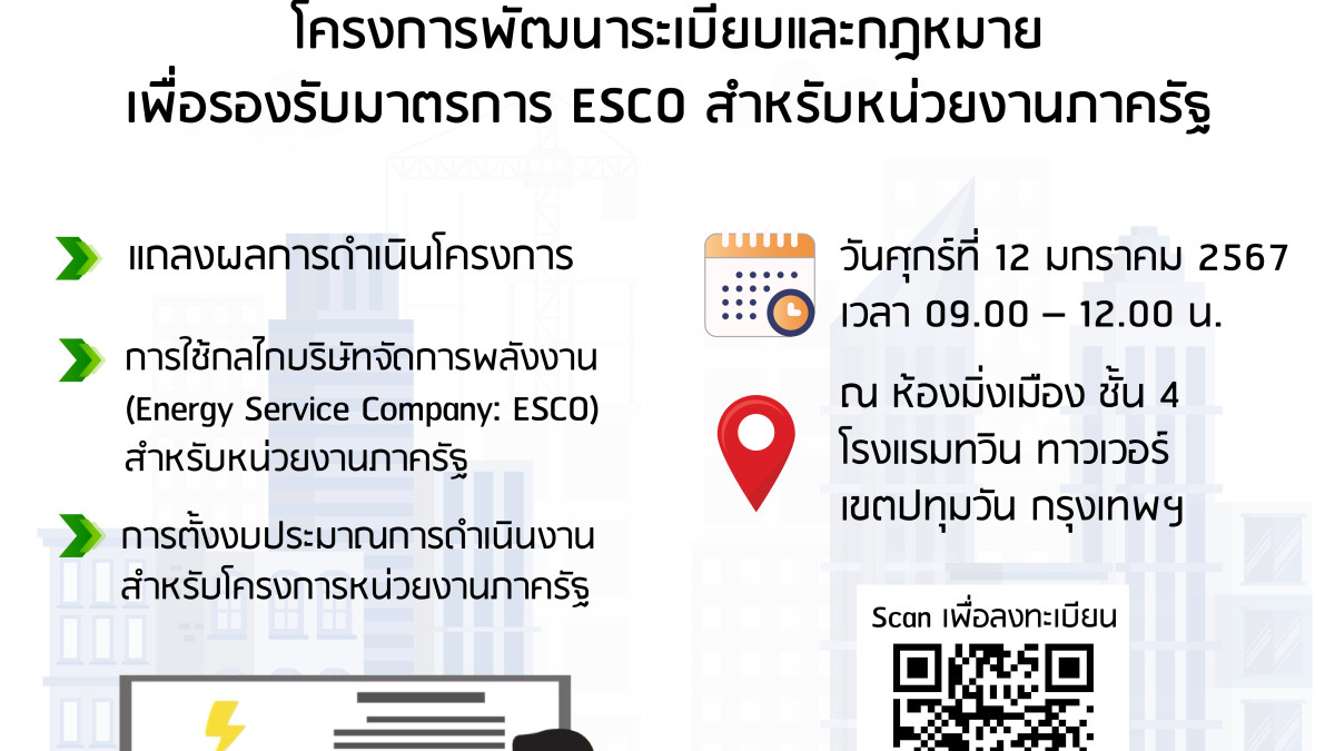 เชิญเข้าร่วมงานสัมมนาแถลงผลการดำเนินงานโครงการพัฒนาระเบียบและกฎหมายเพื่อรองรับมาตรการ ESCO สำหรับหน่วยงานภาครัฐ
