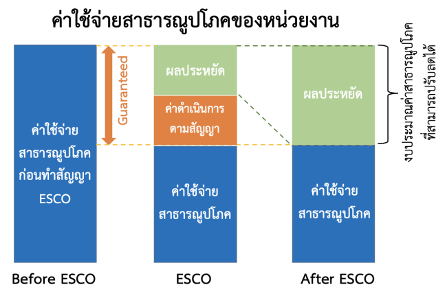 ตามมติคณะรัฐมนตรี เมื่อวันที่ 22 มีนาคม 2565 ได้มติเห็นชอบกำหนดเป้าหมาย ลดการใช้พลังงานของหน่วยงานภาครัฐลงให้ได้อย่างน้อยร้อยละ 20 (รวมไฟฟ้าและน้ำมันเชื้อเพลิง) และให้นำมาตรการบริษัท จัดการพลังงาน (ESCO) สำหรับหน่วยงานภาครัฐ ภายใต้แผนปฏิรูปประเทศด้านพลังงาน และยังเป็นส่วนหนึ่งของแผนขับเคลื่อนกิจกรรมปฏิรูปที่จะส่งผลให้เกิดการเปลี่ยนแปลงต่อประชาชนอย่างมีนัยสำคัญ (Big Rock) และตามแผนการปฏิรูปประเทศ ที่ประกาศในราชกิจจานุเบกษา ณ วันที่ 23 กุมภาพันธ์ 2564 กำหนดการปฏิรูปด้านการอนุรักษ์พลังงานและการใช้พลังงานอย่างมีประสิทธิภาพ ประเด็นปฏิรูปที่ 3 การใช้มาตรการธุรกิจบริษัทจัดการพลังงาน (ESCO) สำหรับหน่วยงานภาครัฐ เนื่องมาจากหน่วยงานภาครัฐมีความต้องการใช้พลังงานสูงขึ้นในแต่ละปี และอุปกรณ์ไฟฟ้าเดิมมีประสิทธิภาพต่ำและขาดการดูแลบำรุงรักษา อย่างไรก็ตาม หน่วยงานภาครัฐไม่สามารถดำเนินการปรับเปลี่ยนอุปกรณ์ได้สำเร็จทั้งหมดเนื่องจากมีข้อจำกัดด้านงบประมาณของการปรับเปลี่ยนอุปกรณ์ และต้องใช้งบประมาณสูงถึง 35,000 ล้านบาท/ปี ดังนั้นการใช้มาตรการ ESCO จึงเป็นมาตรการที่สามารถแก้ปัญหาและข้อจำกัดดังกล่าวนี้ได้ โดยหลักการ ESCO ของภาครัฐนั้น เป็นการลงทุนของกลุ่มบริษัท ESCO ภาคเอกชน ลงทุนปรับปรุงการใช้พลังงานให้หน่วยงานภาครัฐ โดยนำผลประหยัดที่เกิดขึ้นมาจ่ายเป็นค่าดำเนินการให้กลุ่มบริษัท ESCO และมีการรับประกันผลประหยัดพลังงาน